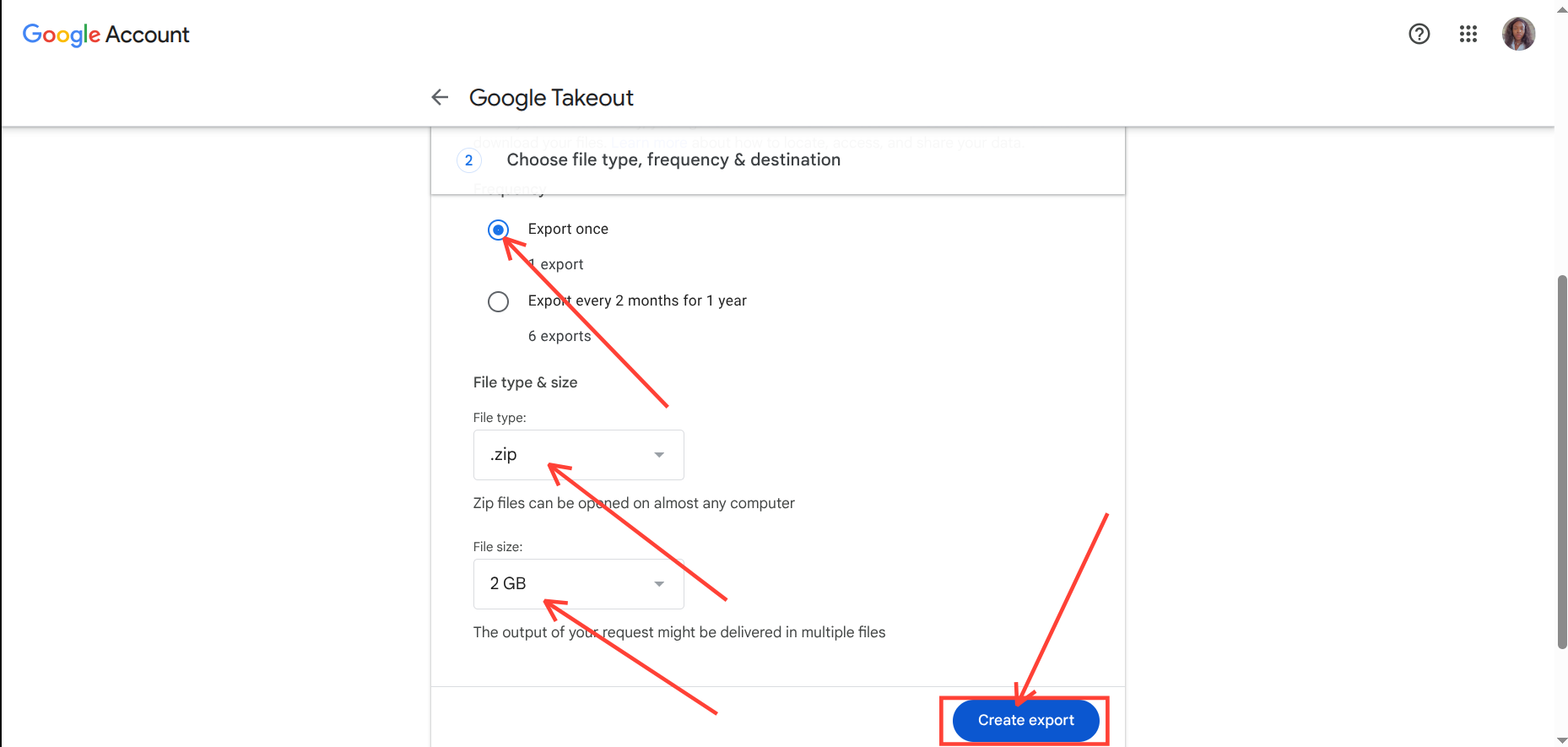 Step 3: Select your Export method, the frequency, the file type, and the size. After that, click Create Export.