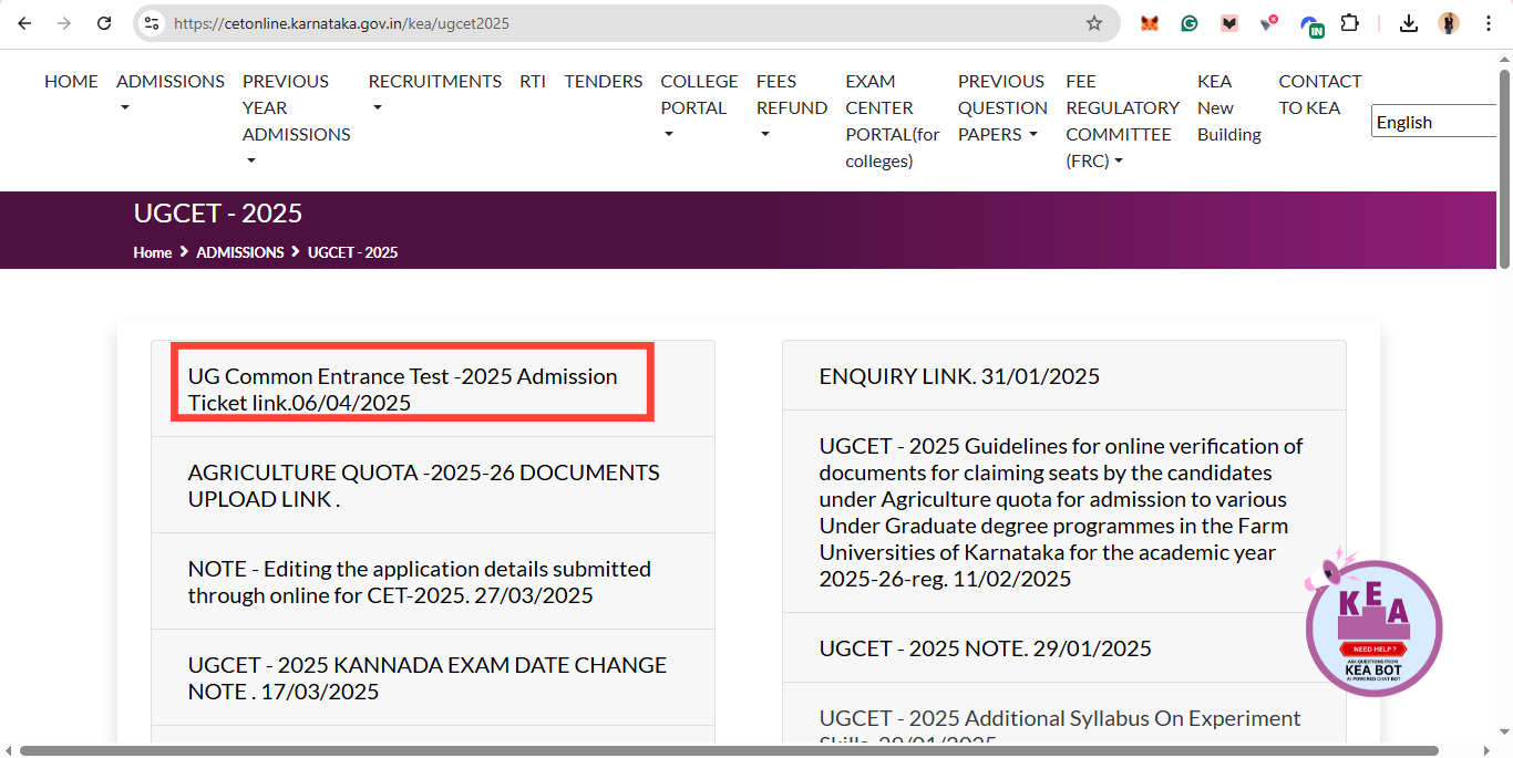 Step 3. Look for the link that says ‘UG Common Entrance Test 2025 – Admission Ticket’ and click on it.