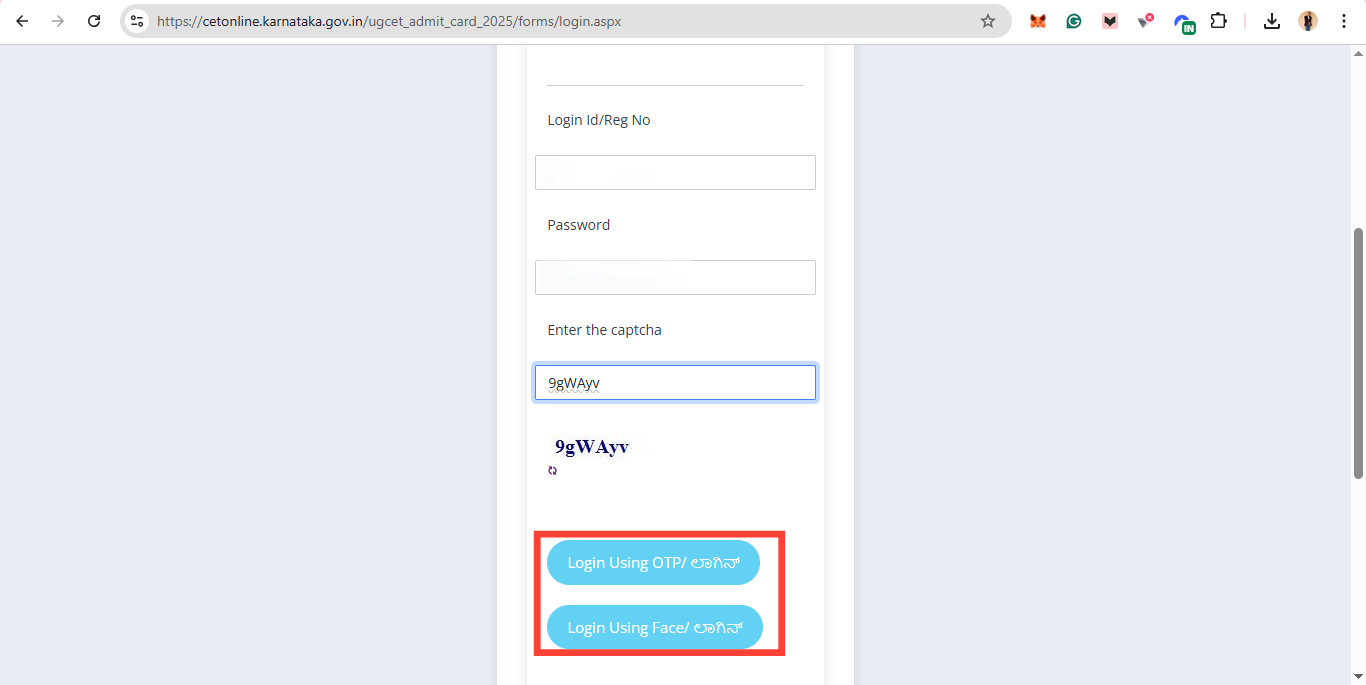 Step 4. You’ll be directed to the login page. Enter the required details, such as your registration number, password, and captcha code. Once done, choose your preferred login method—either Login with OTP or Login with Face ID—and click to proceed.