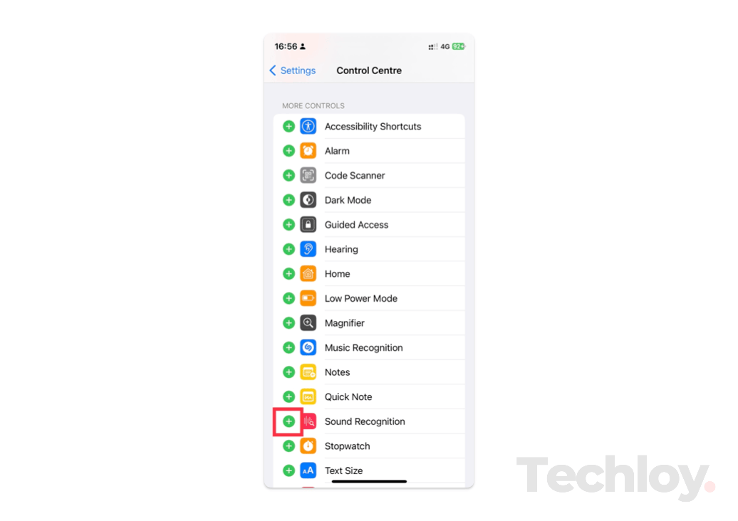 4. To add a Control, scroll down to More Controls and tap on the green plus symbol next to the Control that you want to add.