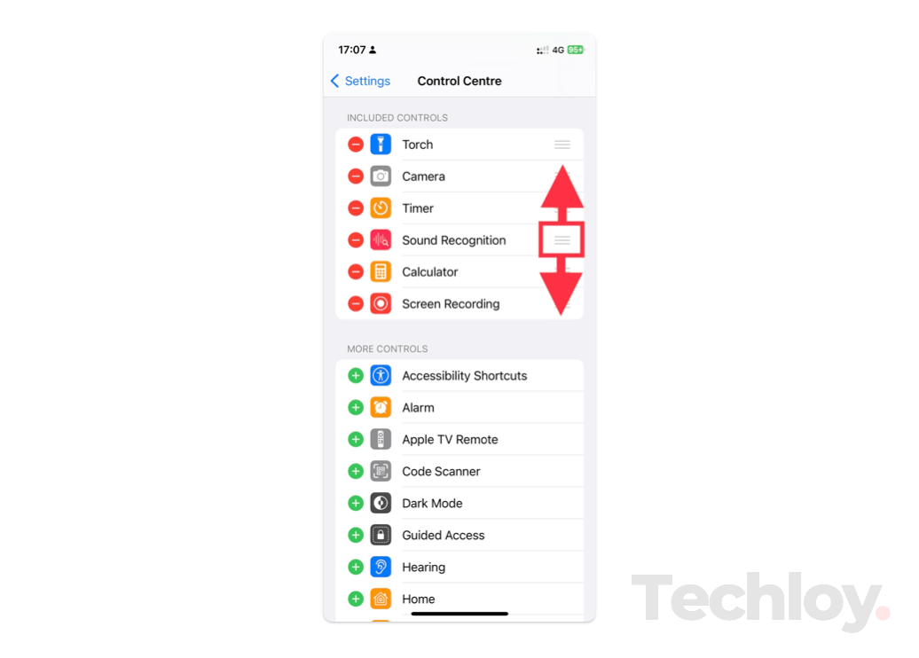 5. If you intend to reorganize the layout of your Controls in the Control Centre, tap and hold the three lines icon next to a Control. Then drag to the position of your preference.