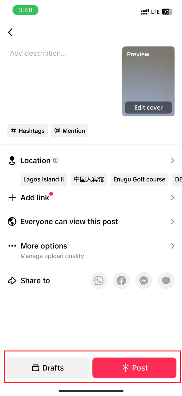 Step 6: You can then add a description, hashtags, links, and location. When you're done, you can choose to save the edited video as a draft or post it