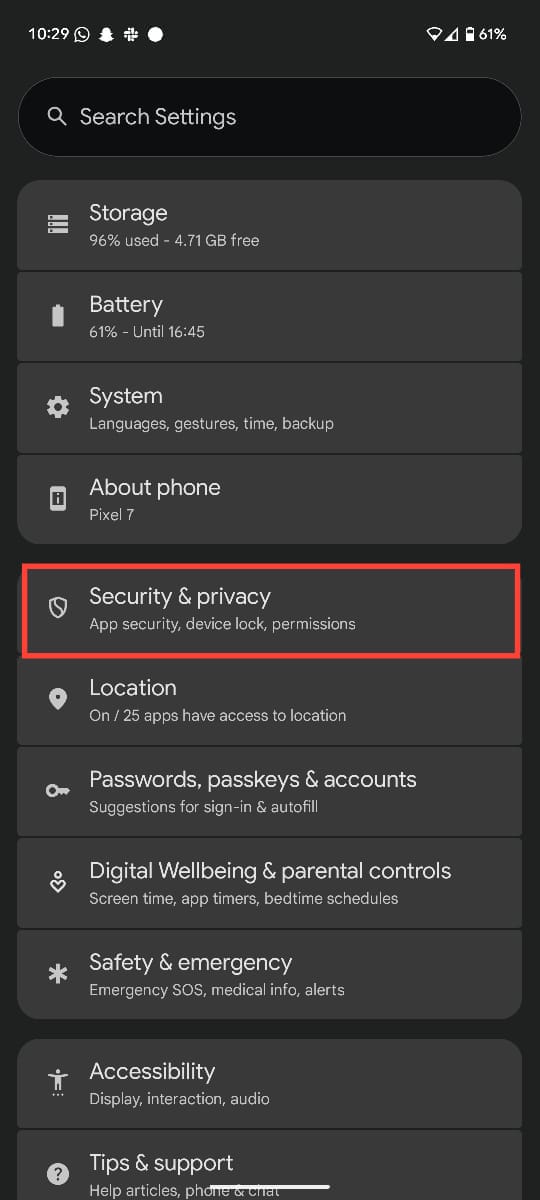 Step 1: Open the Settings app on your Google Pixel phone and scroll down and select Security and Privacy.