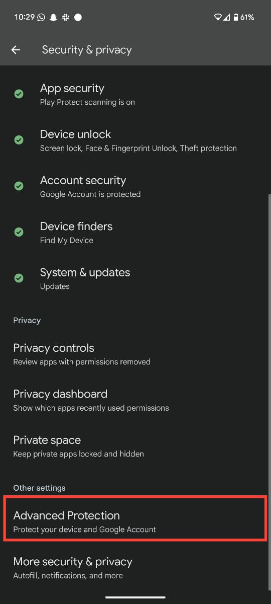 Step 2: Scroll down and choose Advanced Protection under Other settings.