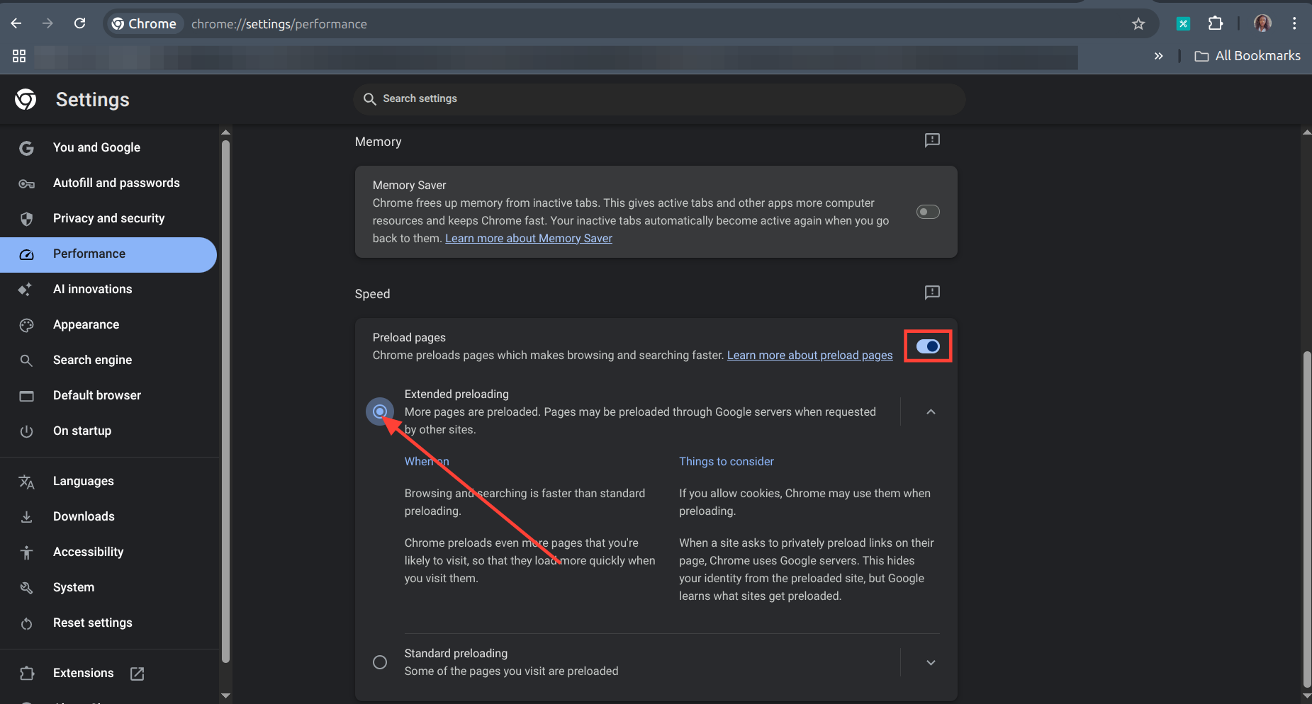 Step 3: Scroll down to Speed on the right panel. Toggle on Preload pages; if it's not enabled, then check the Extended preloading box.