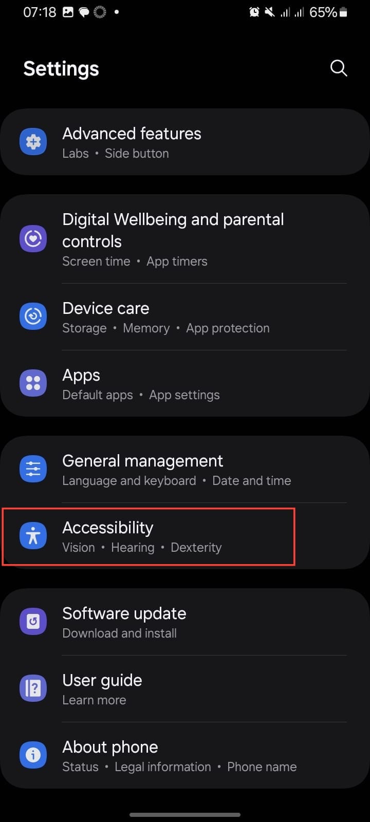 Step 2. Scroll down to "Accessibility" and tap on it.