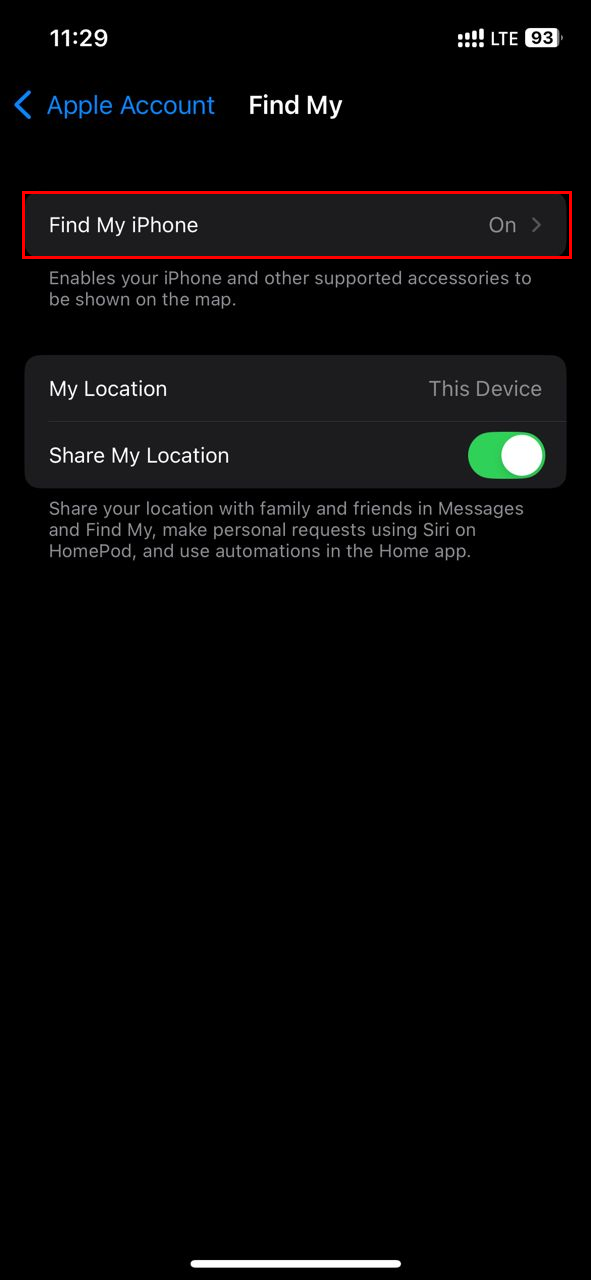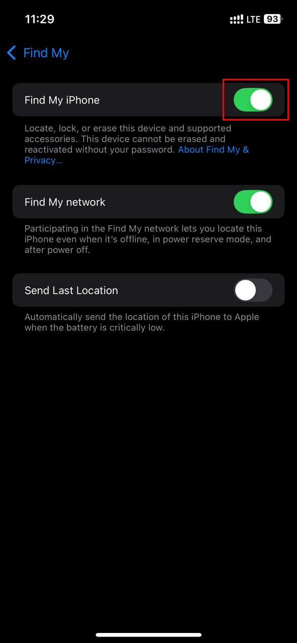 Step 4: You can toggle on or off the Find My iPhone switch to activate or disable the feature