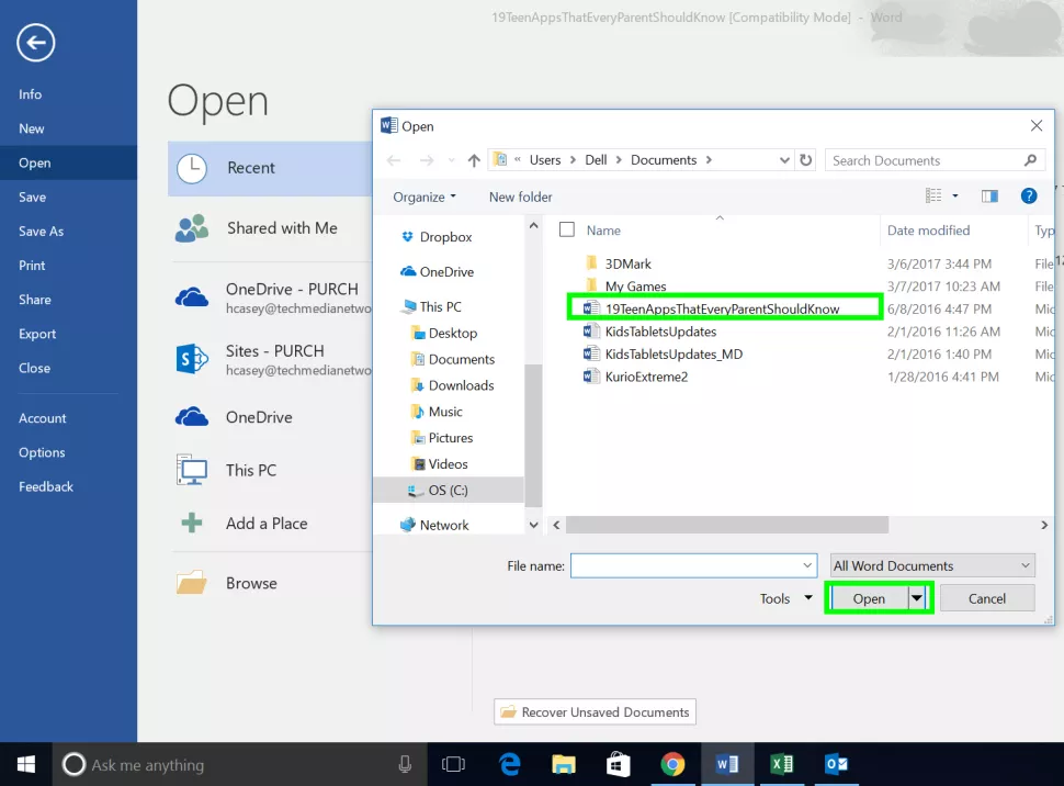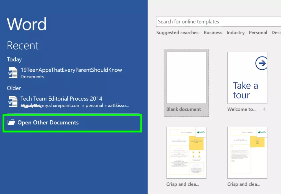 - Open a Microsoft Office program and click Open Other Documents.