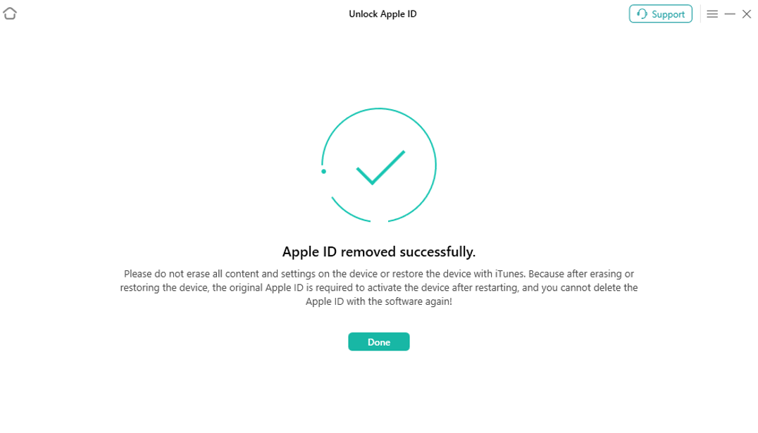 Step 3: Now, AnyUnlock will start removing the Apple ID. When the process is finished, click “Done.”