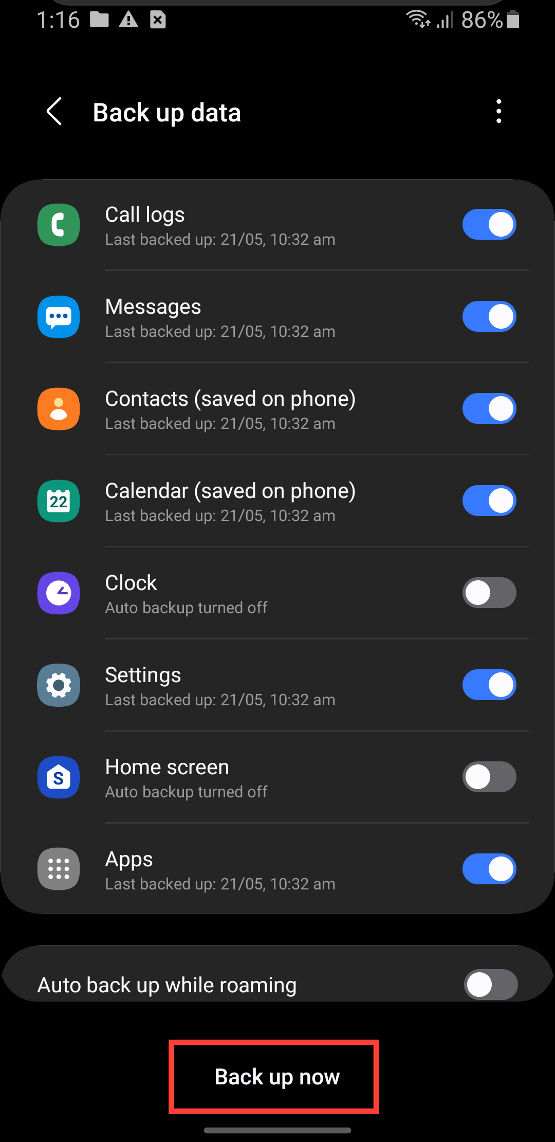 - Select what to save (photos, apps, settings, etc.) by either checking their box or toggling them (depending on your UI). Once you're done, tap Backup and wait.