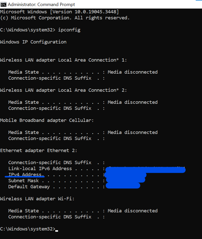 - Run the command ipconfig on the terminal. A bunch of results will pop up, but look for IPv4Address the number by the side is the IP address.