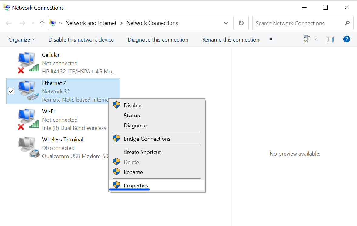 - When you select this, your connections (disconnected and active) will be made available to you. Right-click on your available connection and select properties.