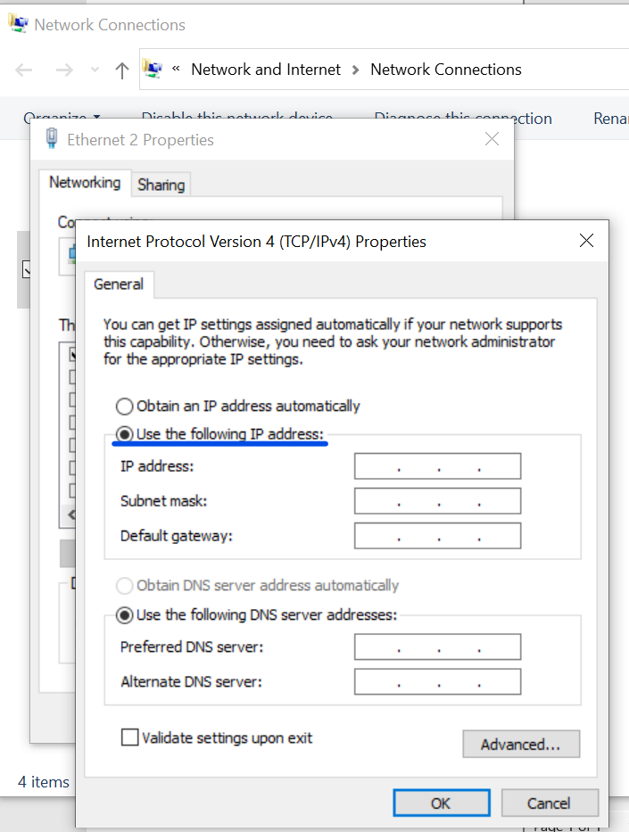 - Click on the checkbox use the following IP address, and then enter your desired IP address, Subnet mask, and Default gateway.