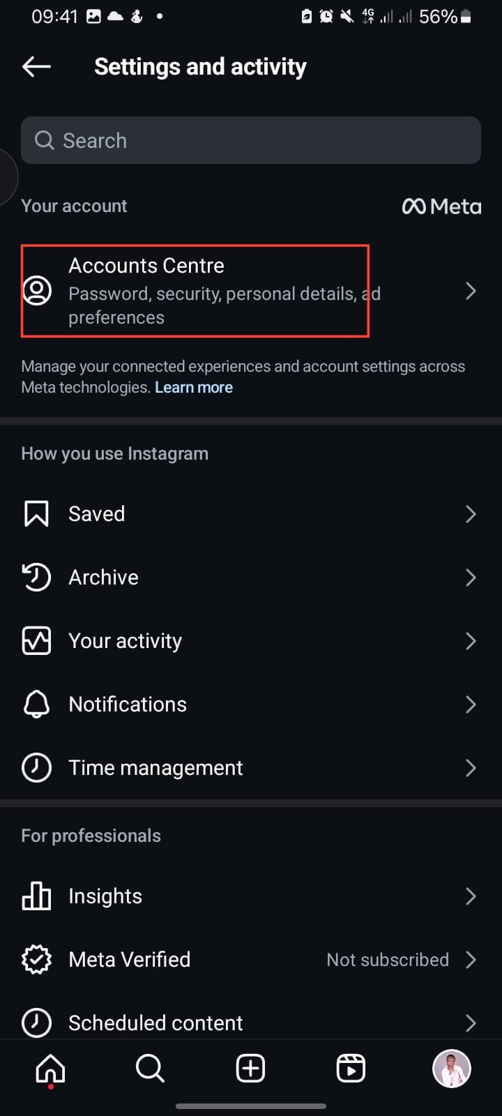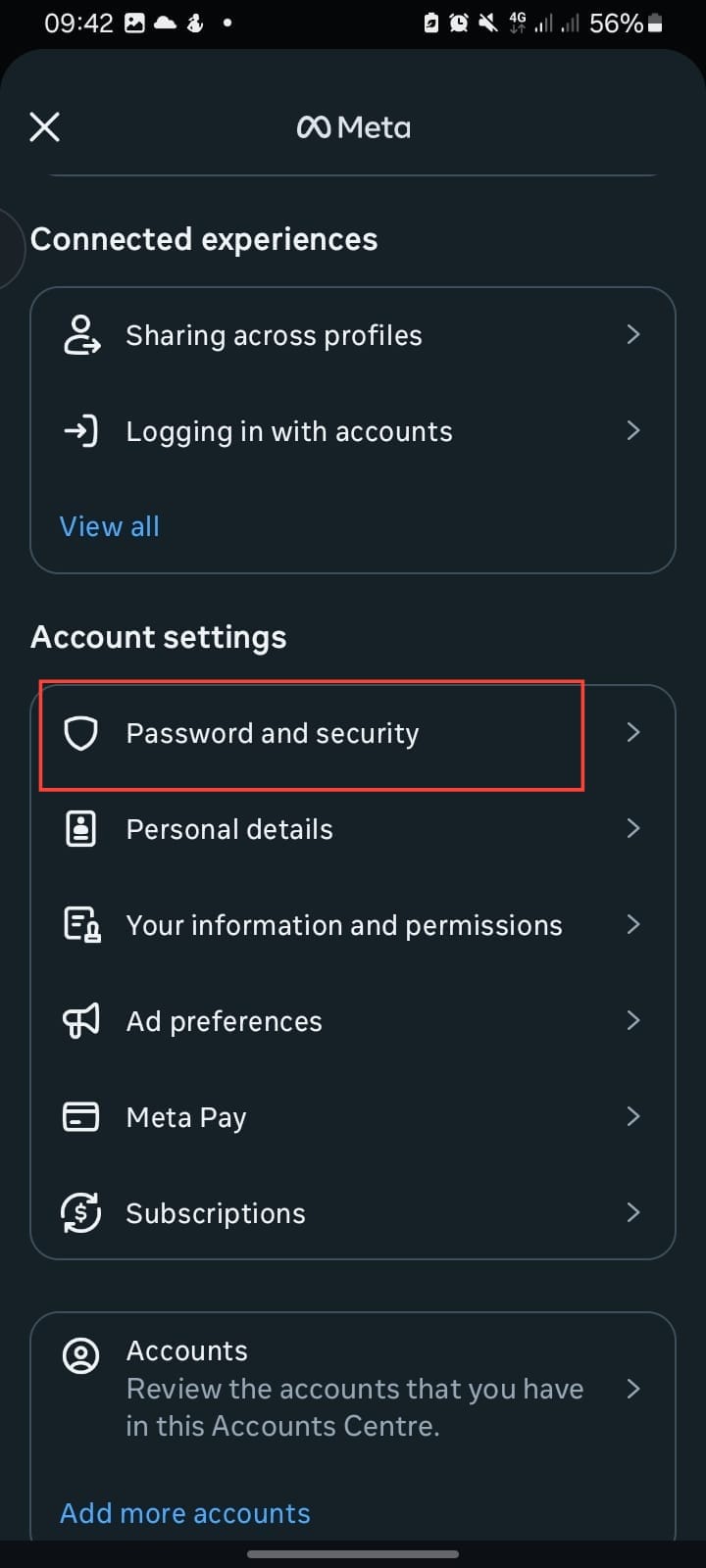 Step 3. Tap Accounts Centre, then scroll down to Password and Security.