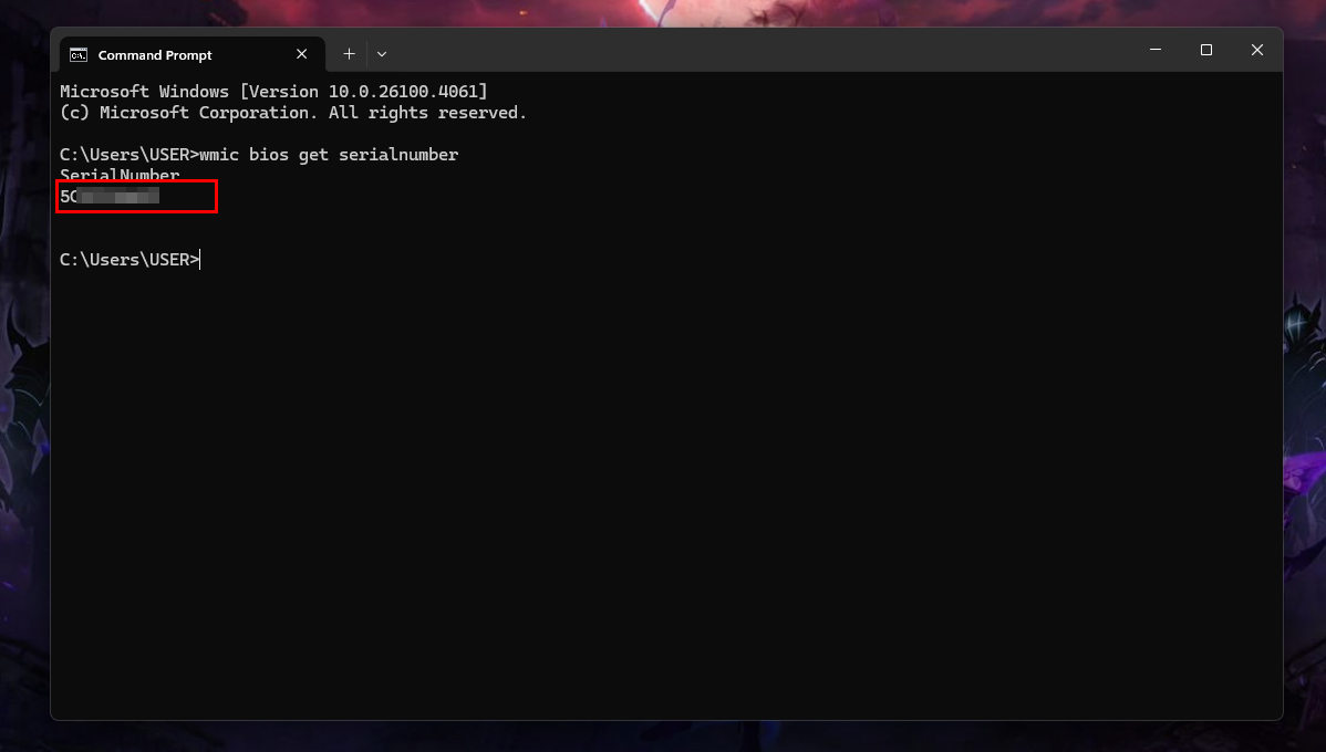 Step 2: In the Command Prompt window, type "wmic bios get serialnumber" and press Enter
