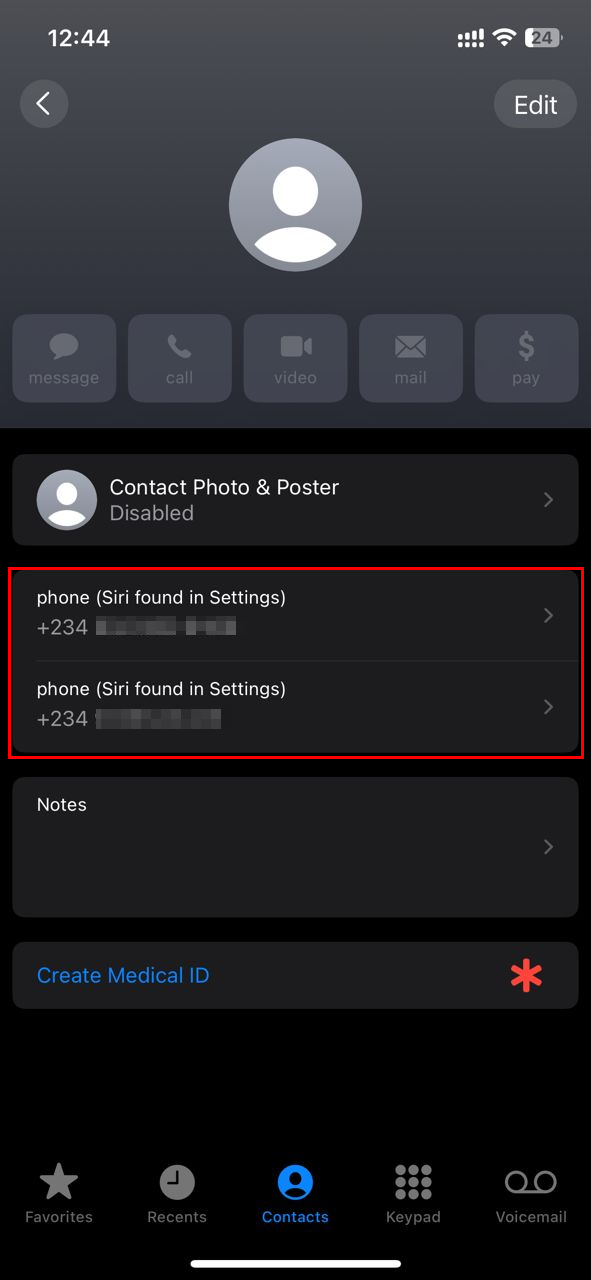 Step 3: You should see your phone number(s) when the contact card opens