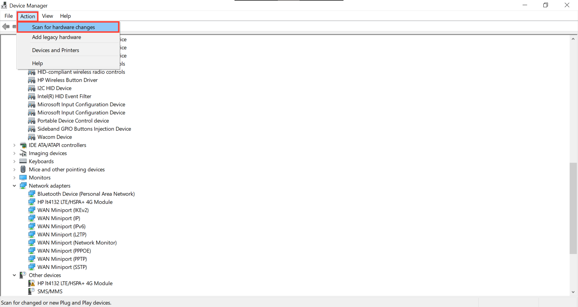 Step 5: In the Device Manager toolbar, click "Action" and then select "Scan for hardware changes". This action will prompt Windows to automatically reinstall your network adapter and its associated drivers.
