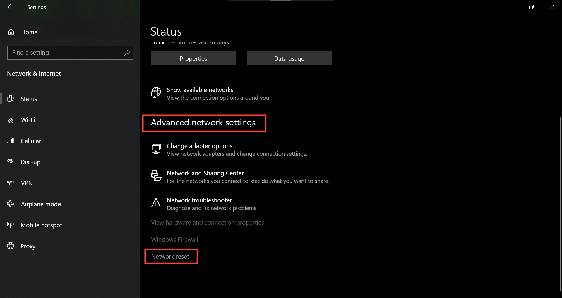 Step 3: On the right panel, click "Network reset" under "Advanced network settings" at the bottom.