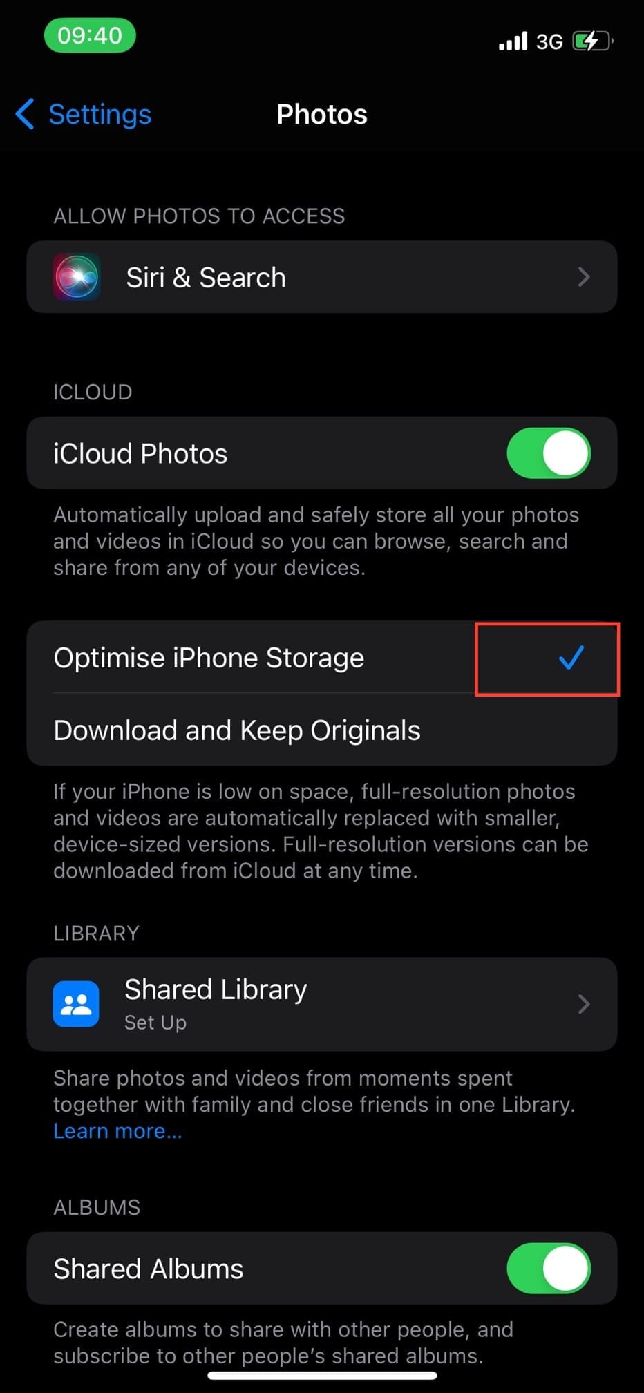 Now that your iCloud Photos is enabled, you can optimize your iPhone storage.