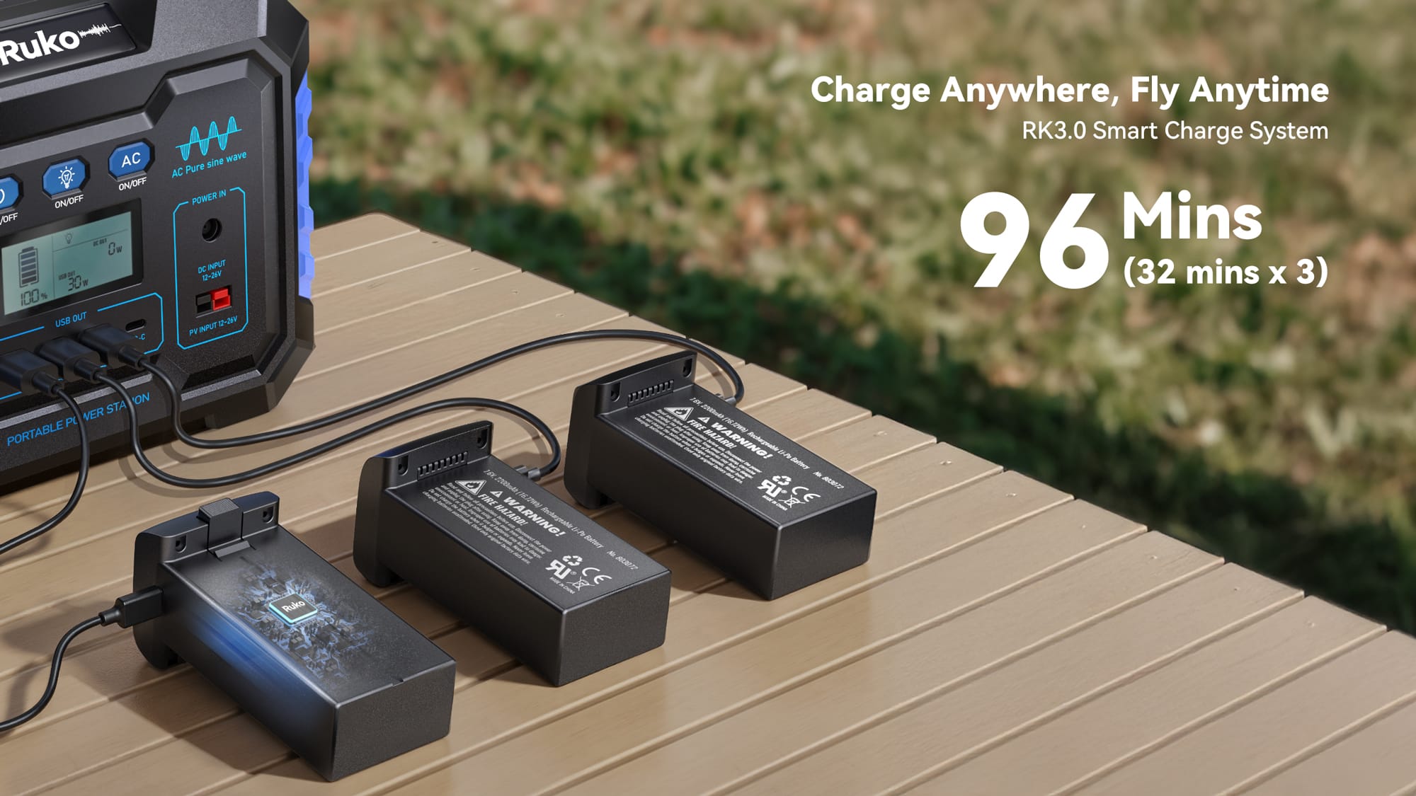 Around 32 minutes in ideal conditions. If you are worried that one battery is not enough for your photography, Ruko also offers a three-battery set for purchase, which provides a full 96 minutes of flight time.