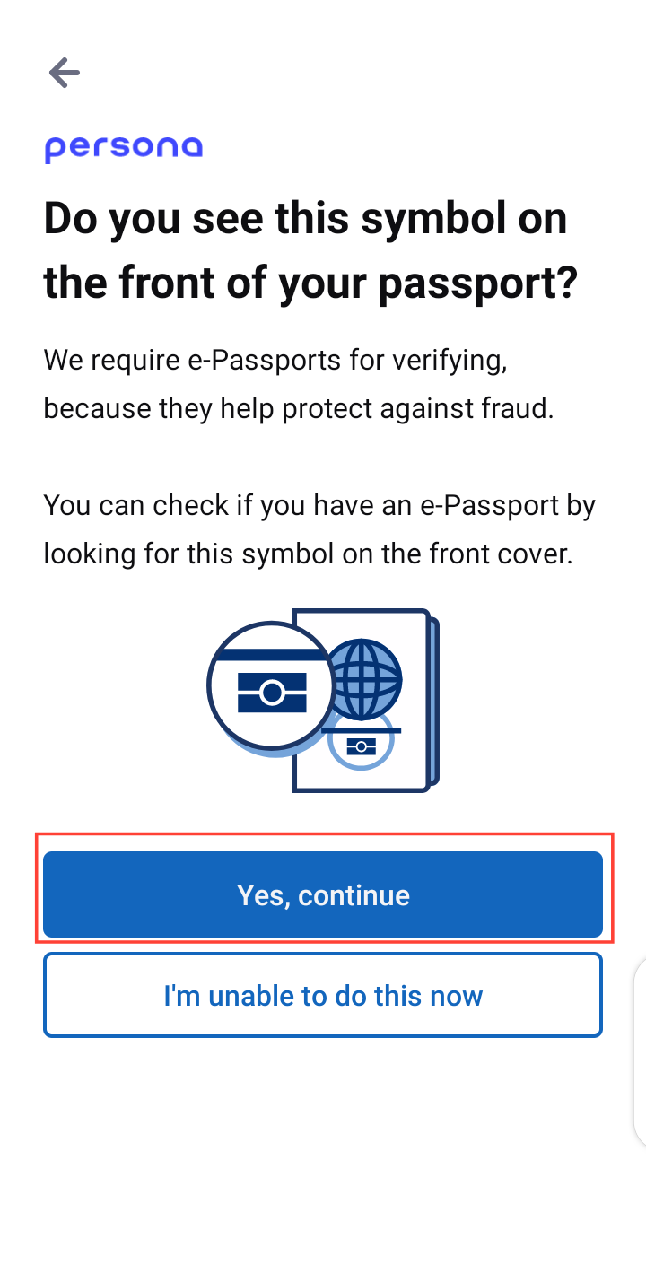 - After this, tap “Yes, continue” to upload your passport. The passport must be Near Field Communication (NFC) enabled or e-passport.