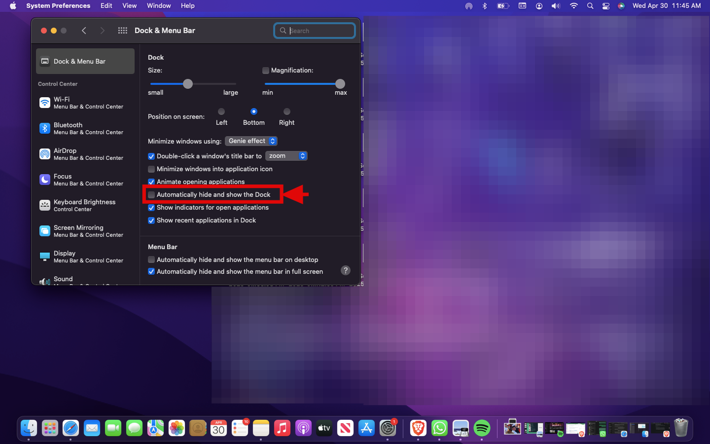 Step 4: To enable Auto-hide, go to the Dock section and find the check box labeled Automatically hide and show the Dock. Turn this on to hide the Dock when not in use
