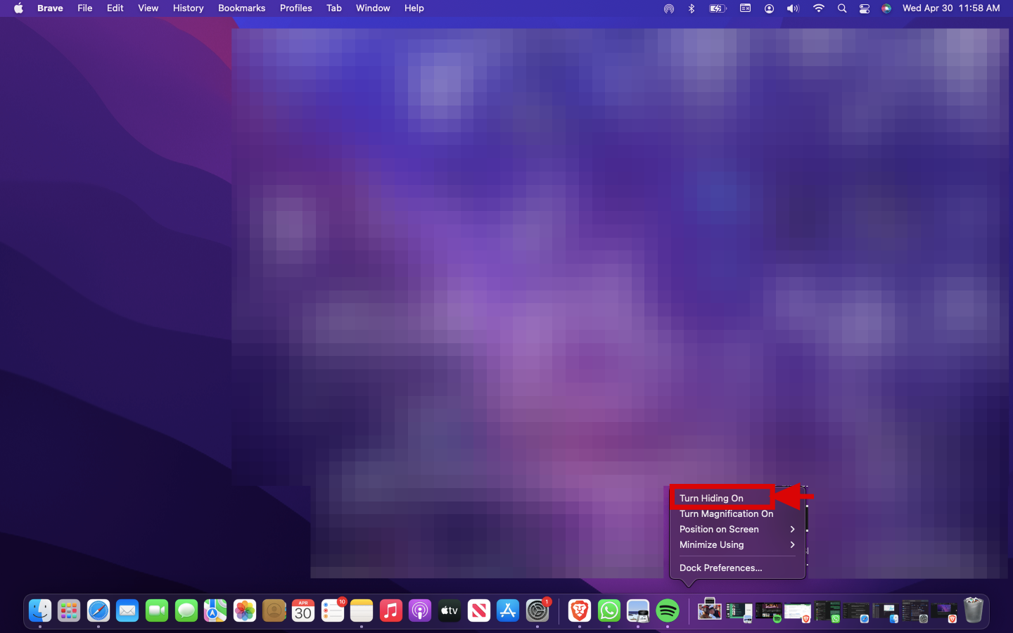 Step 2: Click Turn Hiding On from the menu that pops up, this hides your dock