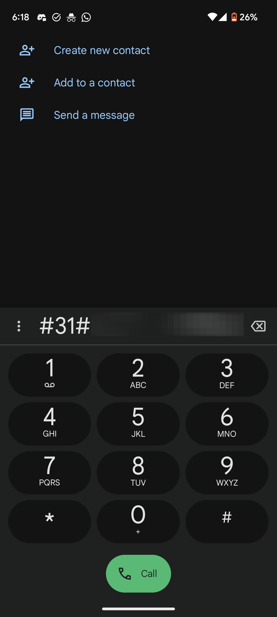 Dial the prefix #31# before the phone number you wish to call. For example, to call (123) 456-7890, dial #31# 123 456 7890.