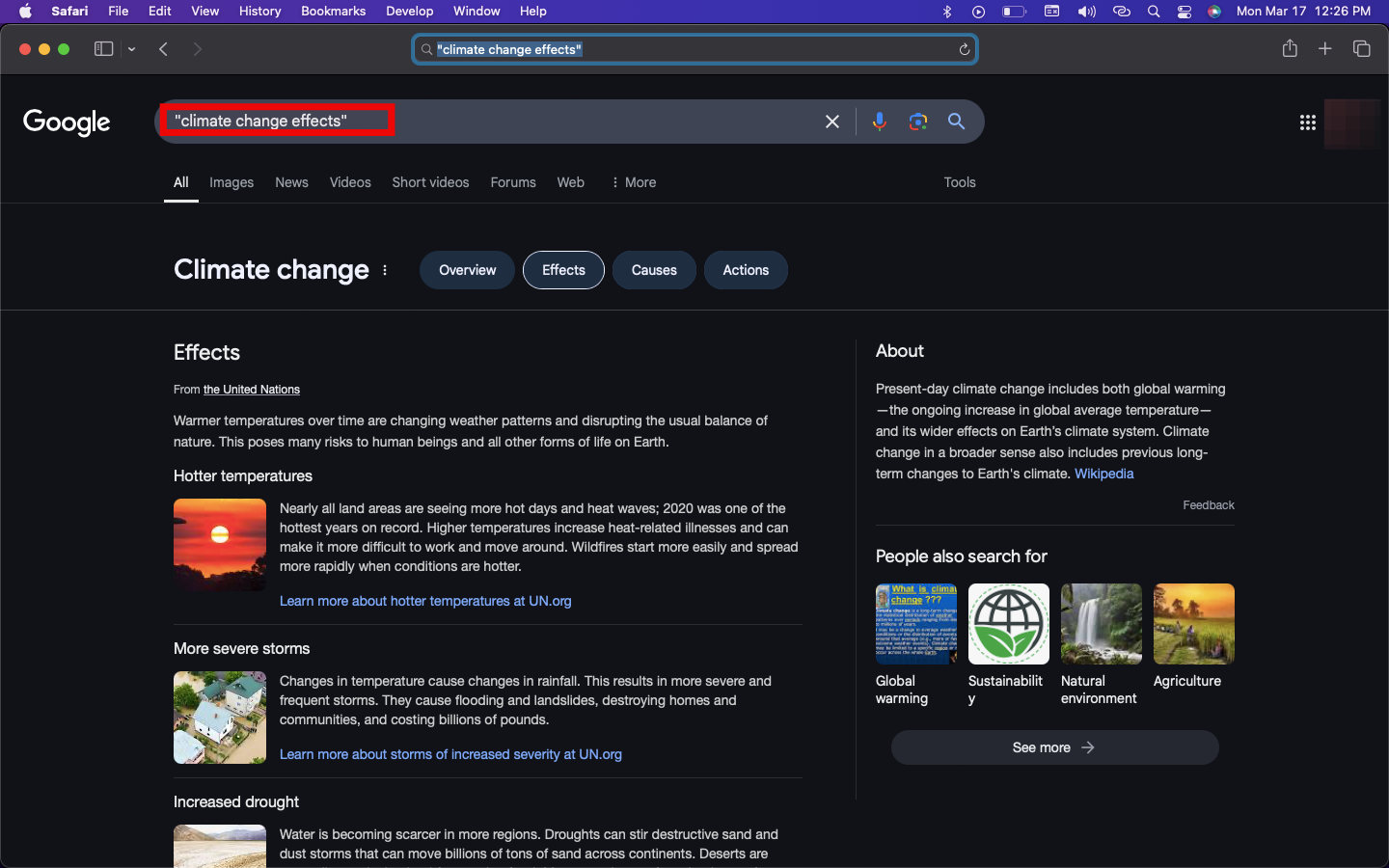 To find the exact phrase (e.g. climate change effects), type it in quotes. This finds results with the exact phrase, not just individual words.