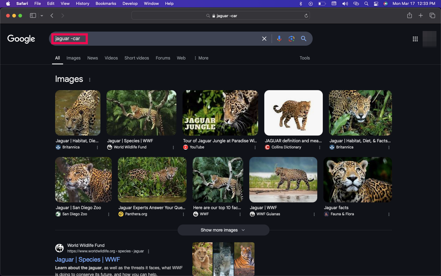 Use the minus sign (-) before the word you want to exclude. This removes irrelevant results (e.g. jaguar -cars removes results showing the car when you’re looking for the animal).