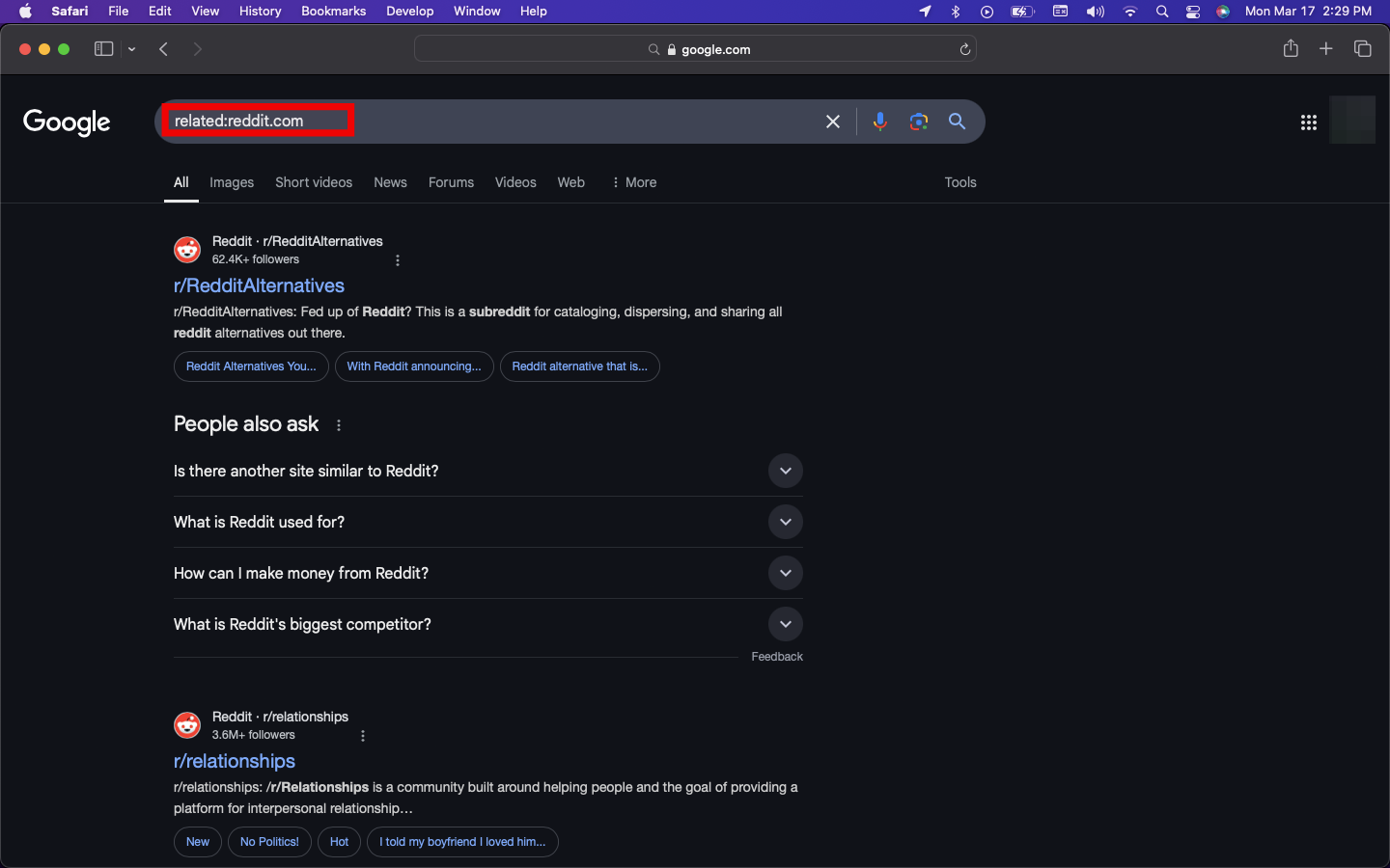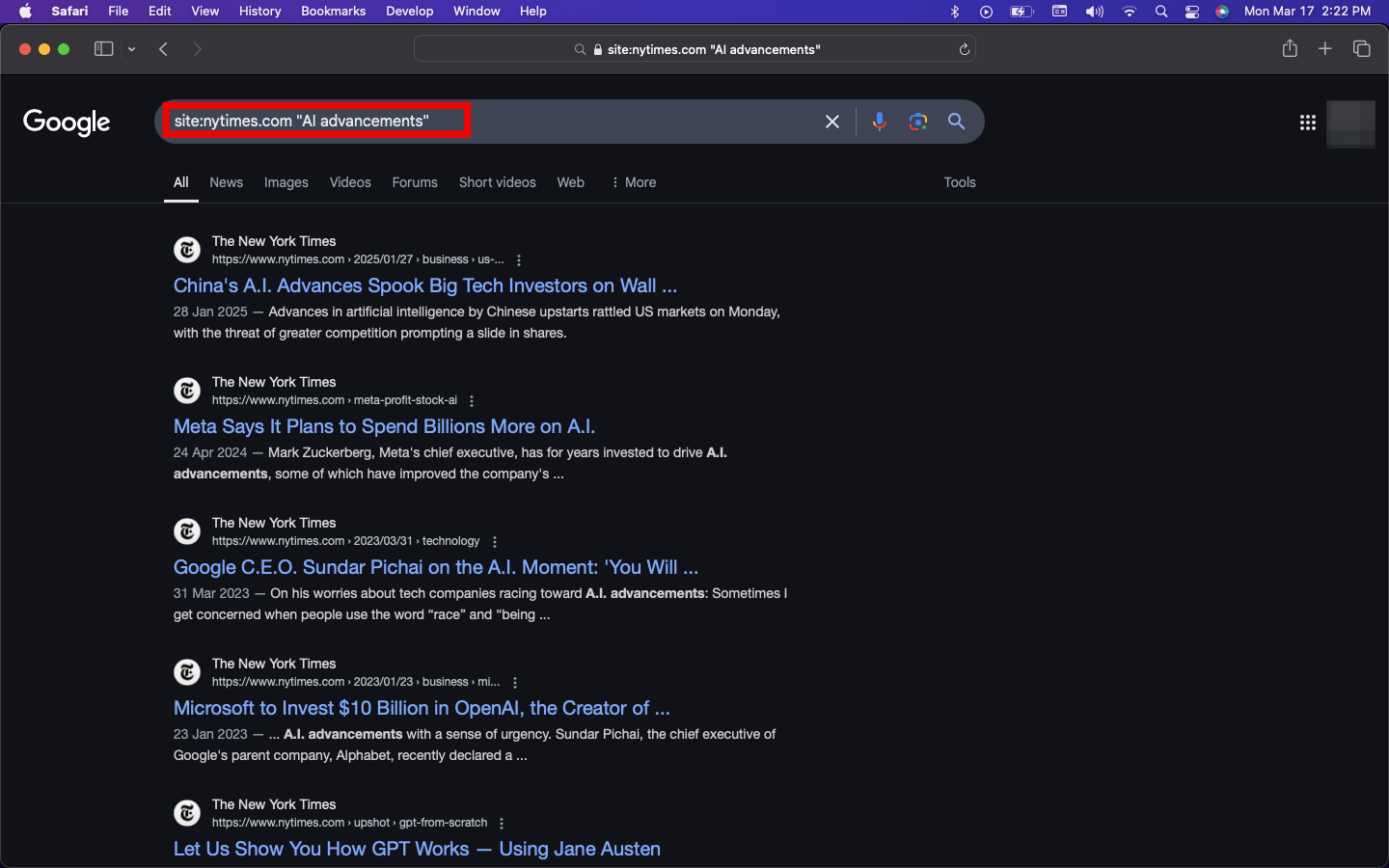 Add the site: operator followed by the domain of the website you want to search, this limit results to a specific website.