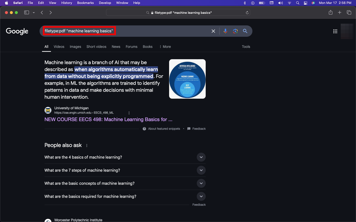 You can combine two operators for greater precision. For instance, you can use the site: and filetype: operator together to allow you to obtain highly targeted results.