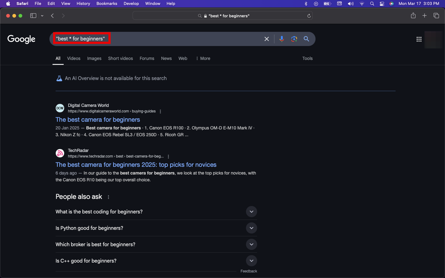 You can use an asterisk (*) as a placeholder for unknown words or phrases in your search query. For example, if you search for "best * for beginners", Google will try to fill in that blank with different words, showing you results like "best camera." And yes, it's important to keep those quotation marks around the whole phrase when you do this!