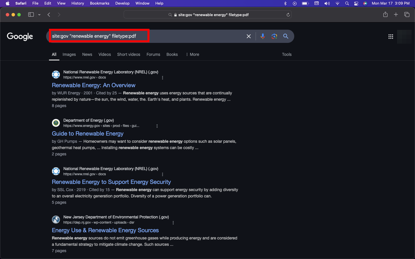 In the example below we used site:gov"renewable energy"filetype:pdf which combines STEP 3 and STEP 5 search operators to find renewable energy PDF files on government websites.