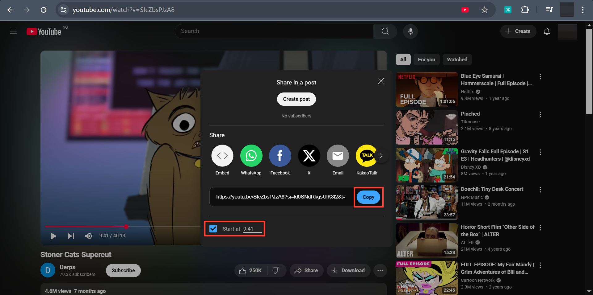 Step 3: Check the "Start at" checkbox under the URL. Then select "Copy" to copy the URL with the timestamp added.