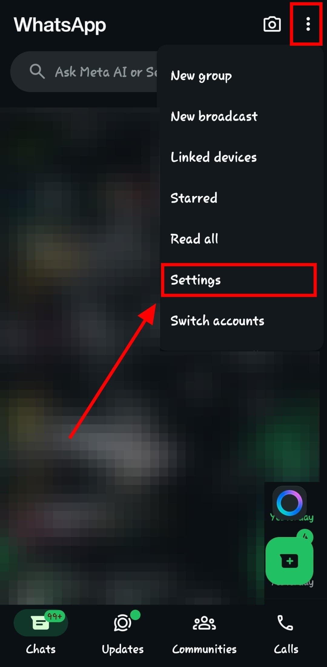 Step 1: Open up WhatsApp and tap on the three-dot button at the top right. Then, tap on 'Settings'