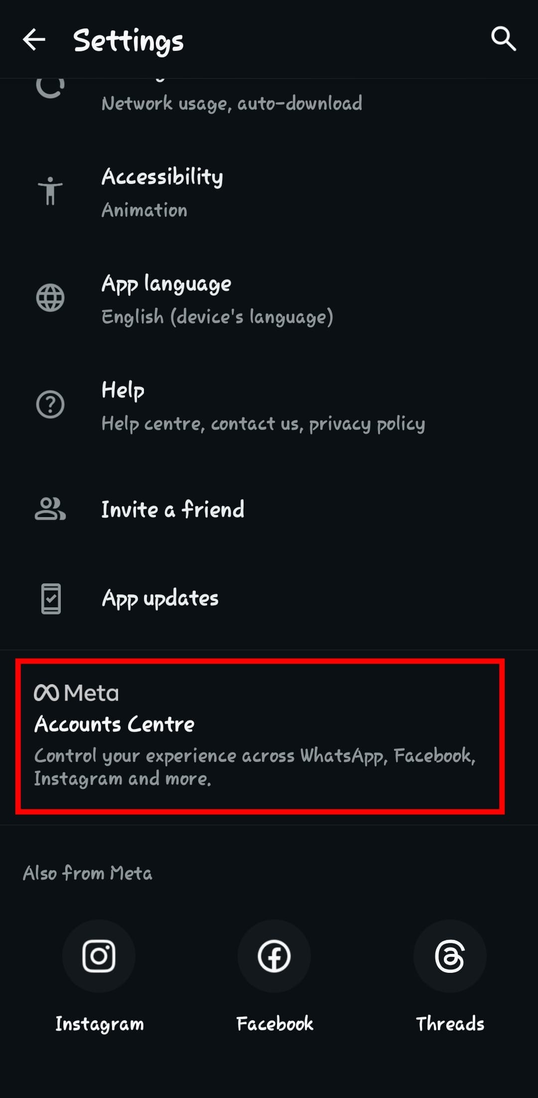 Step 2: Scroll down till you see 'Accounts Centre'