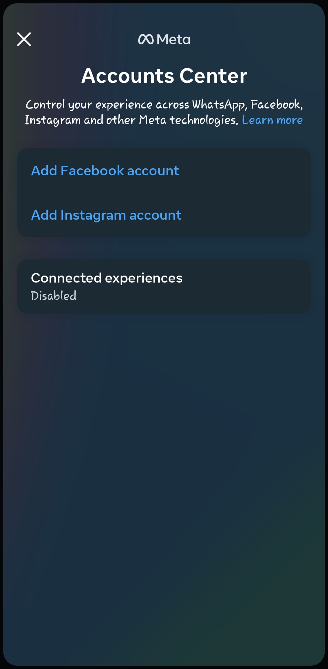 Step 4: In my case, none of my other Meta apps have been added, so to add them, simply tap on one of them, 'Add Facebook account' or 'Add Instagram account'