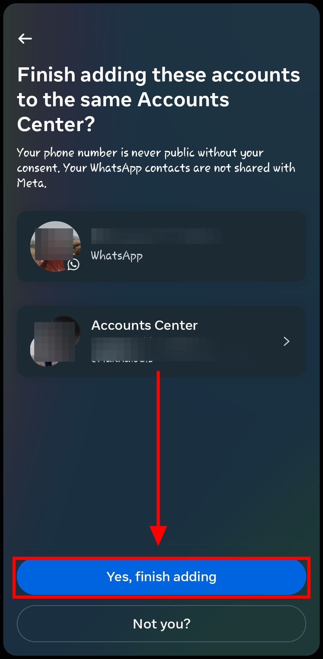 Step 6: You should see your accounts pop up on the screen for the account you decided to add, alongside your WhatsApp account too. Simply tap 'Yes, finish adding' to continue'