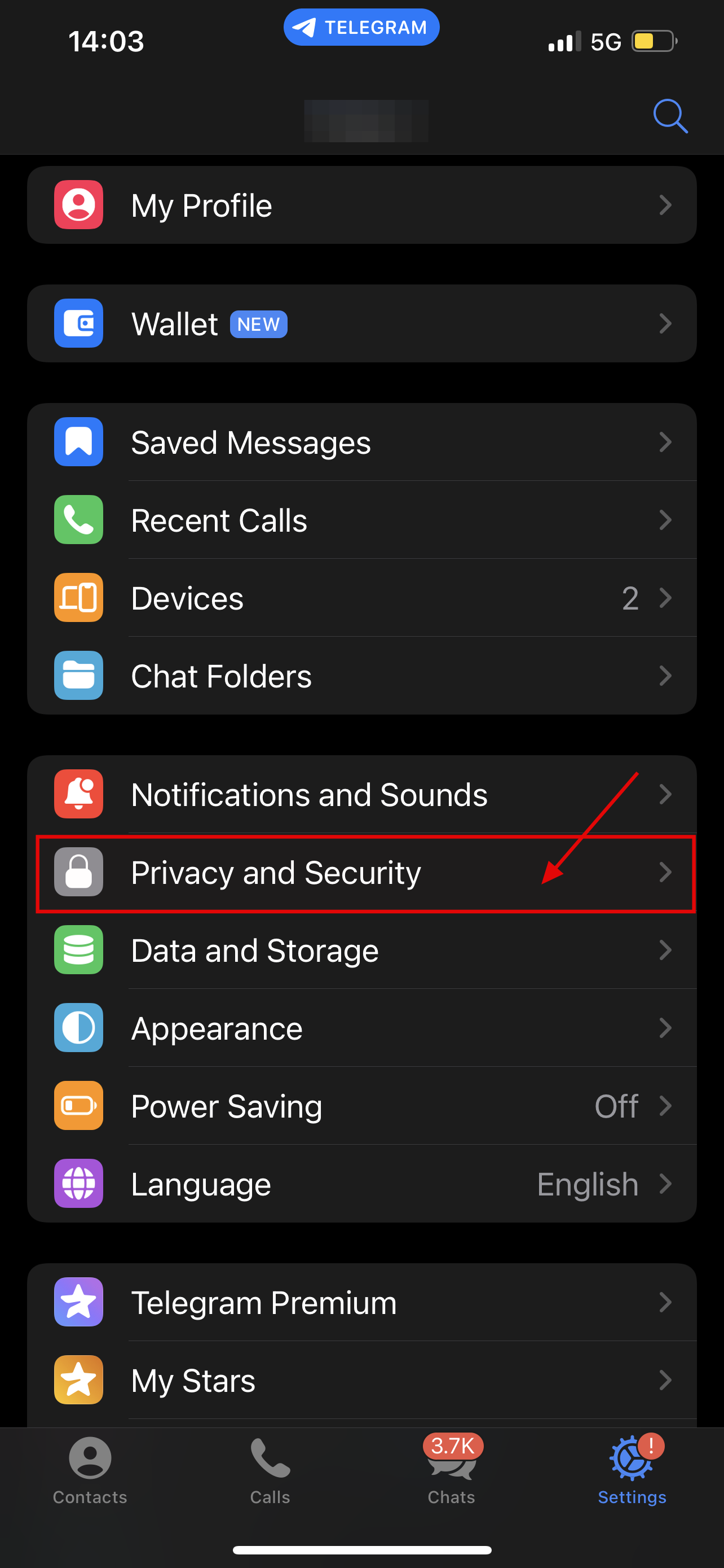 Step 2: Click on Settings, then scroll down and select Privacy and Security
