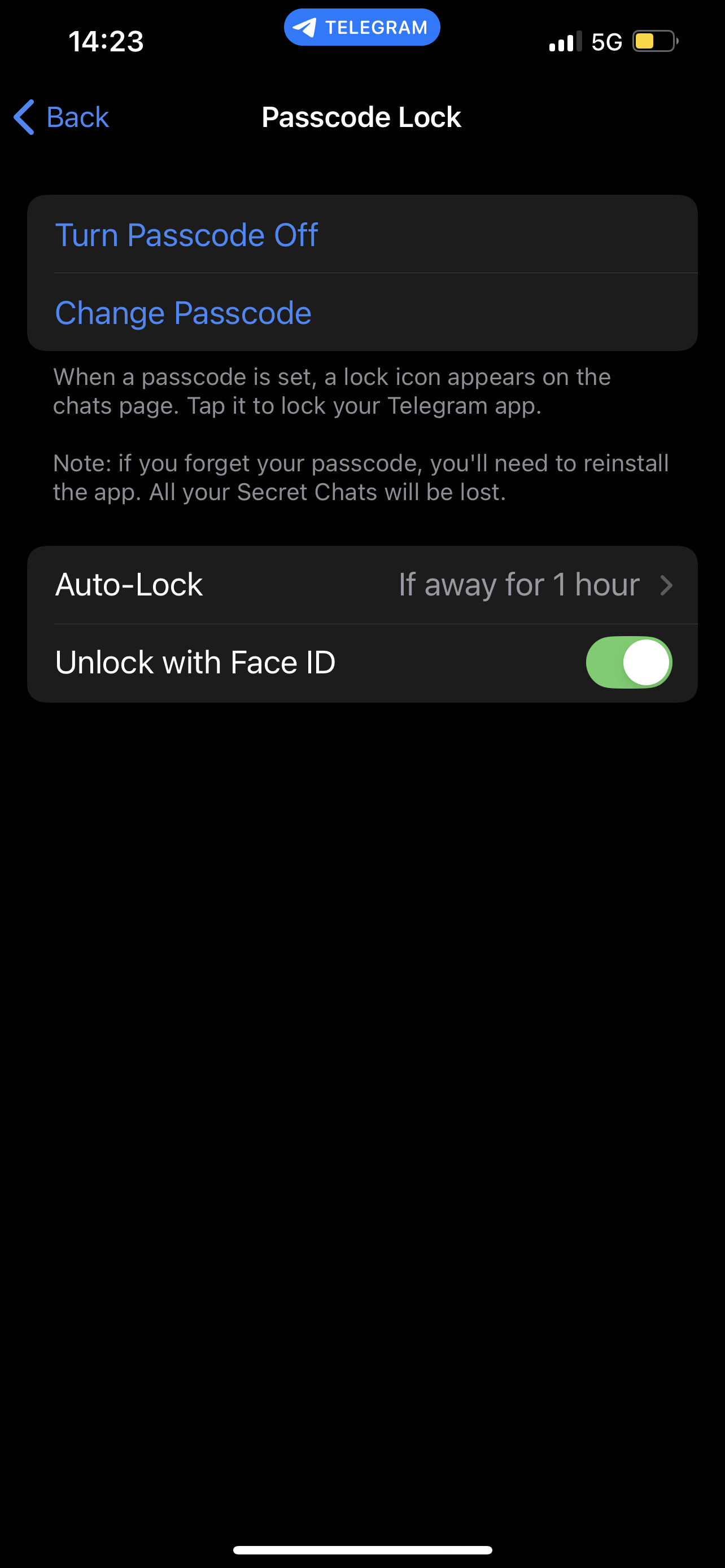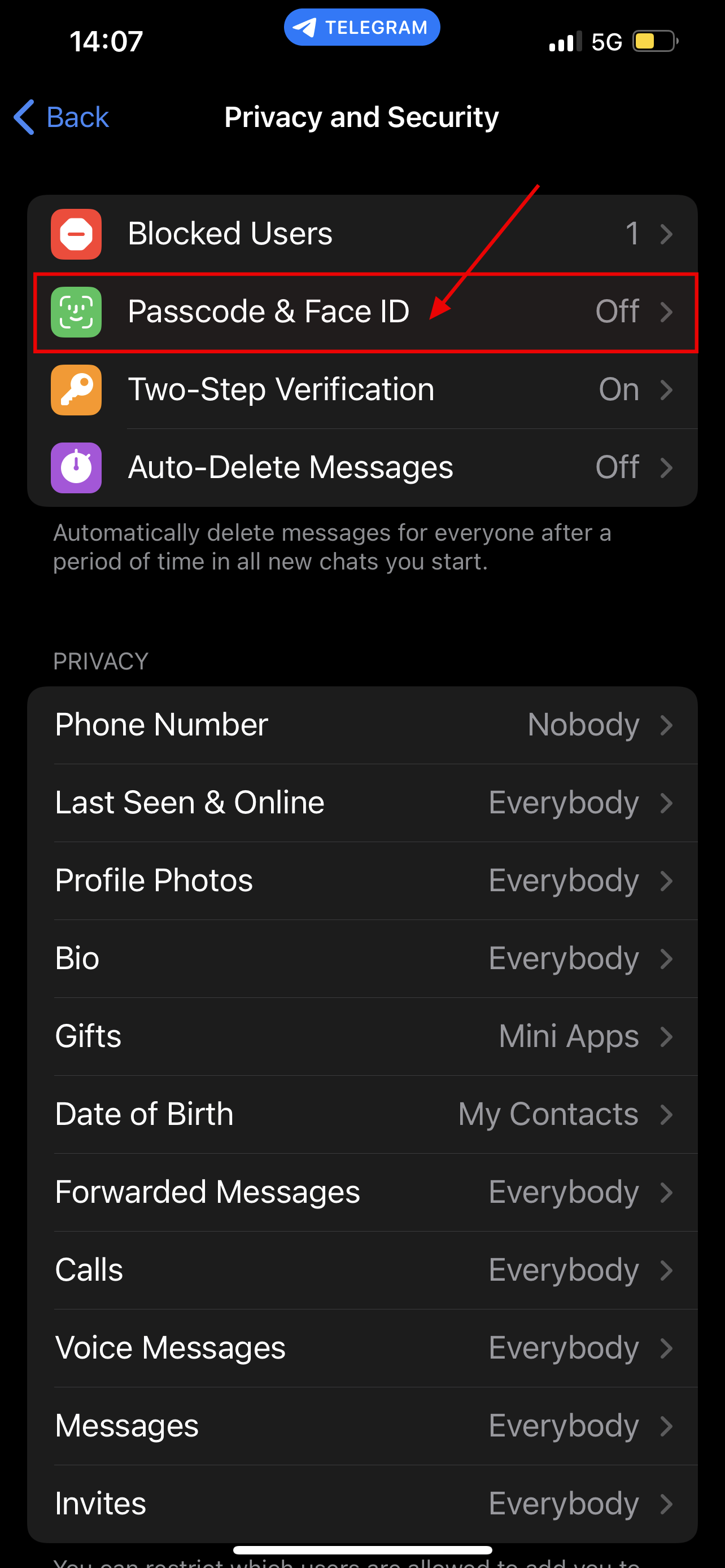 Step 6: You can toggle on Unlock with Face ID for your account. Additionally, you have the option to Auto-Lock the app, which automatically locks your Telegram chats after a set period of time
