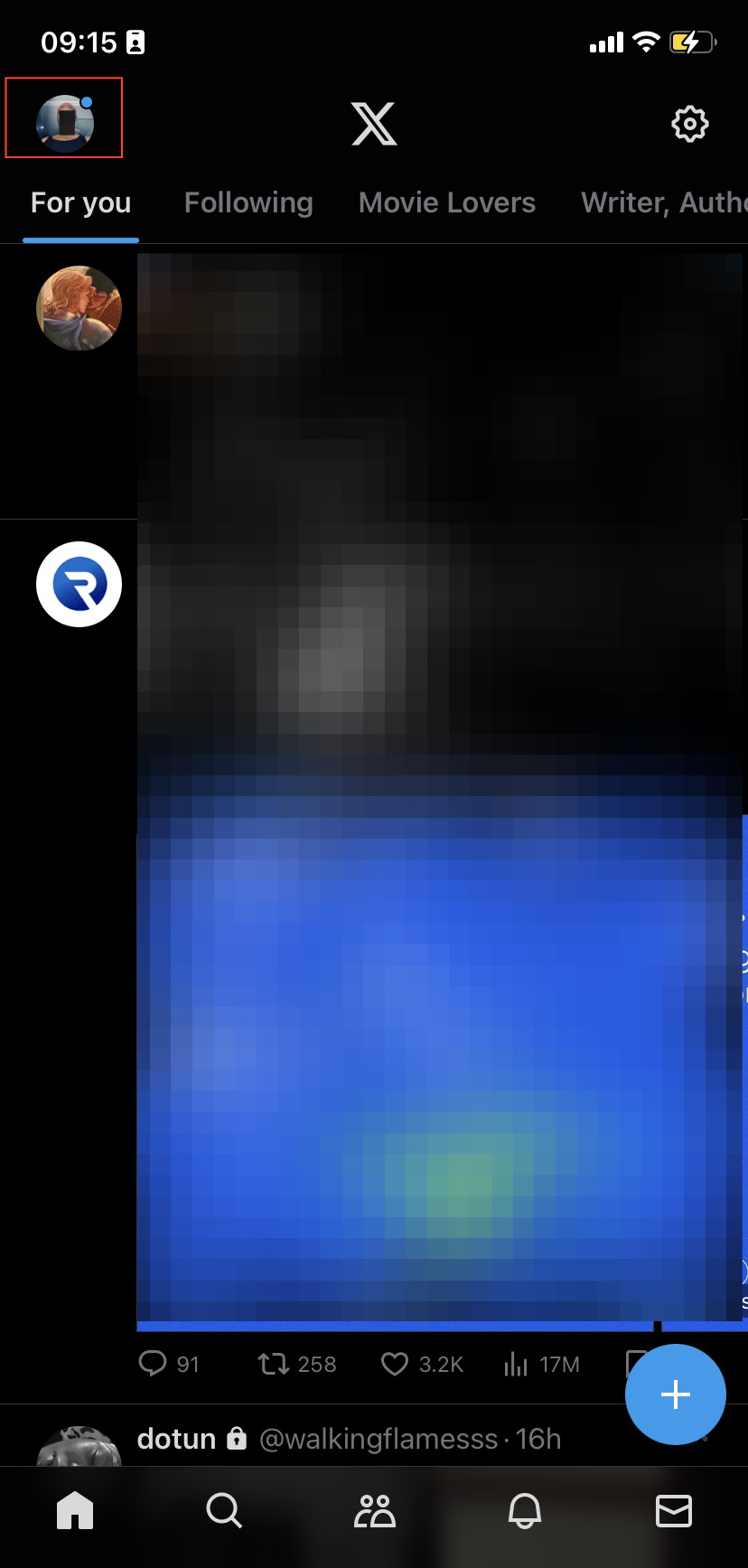 - Open the X app on your device. Then, tap your profile icon in the top-left corner.