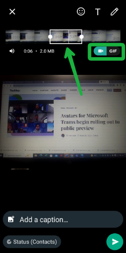 6. Toggle to GIF then click on the send button to upload the GIF on your status