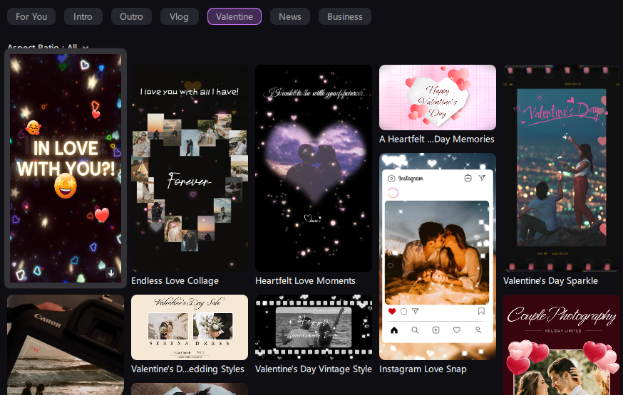 Edimakor offers video templates that are designed for special occasions like Valentine's Day.