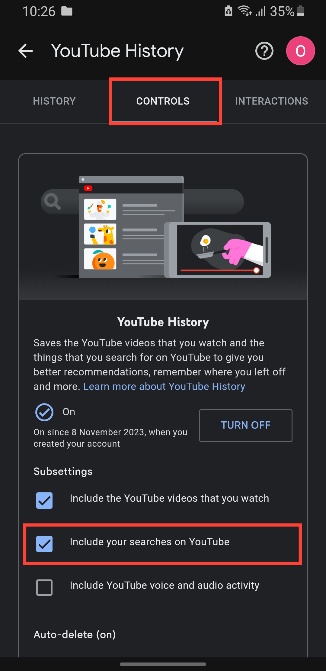 Step 4: Select control tabs and unselect "Include your searches on YouTube."