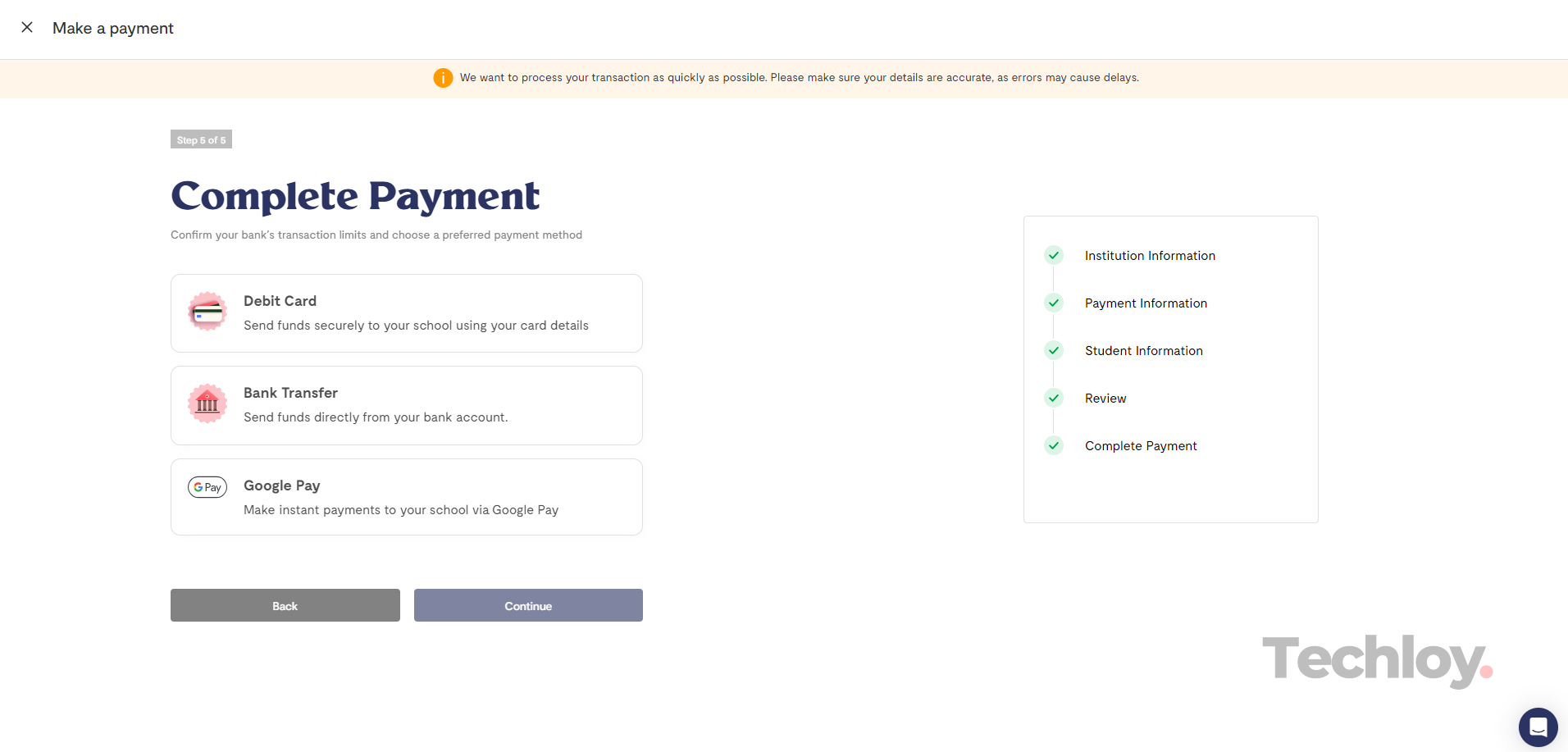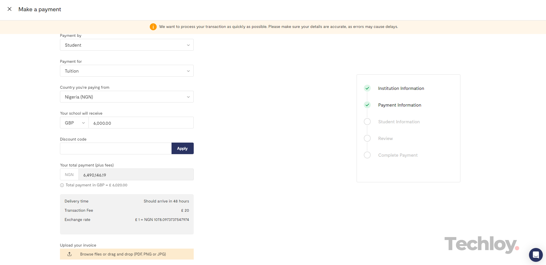 Next, enter your student information. Please note that this information will be sent to your institution along with the payment you're making. Please note that you are required to upload your student ID or admission letter.