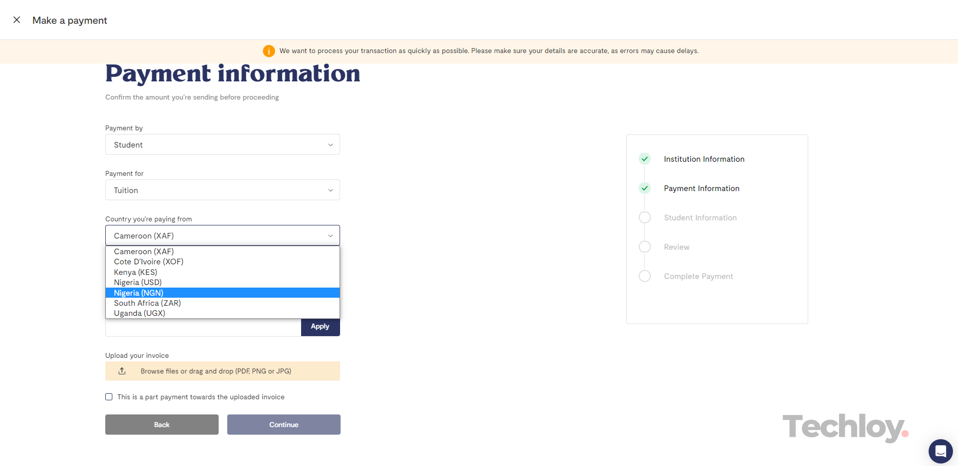 Also, upload an invoice (received from your school) for the payment you want to make, then click on Continue.