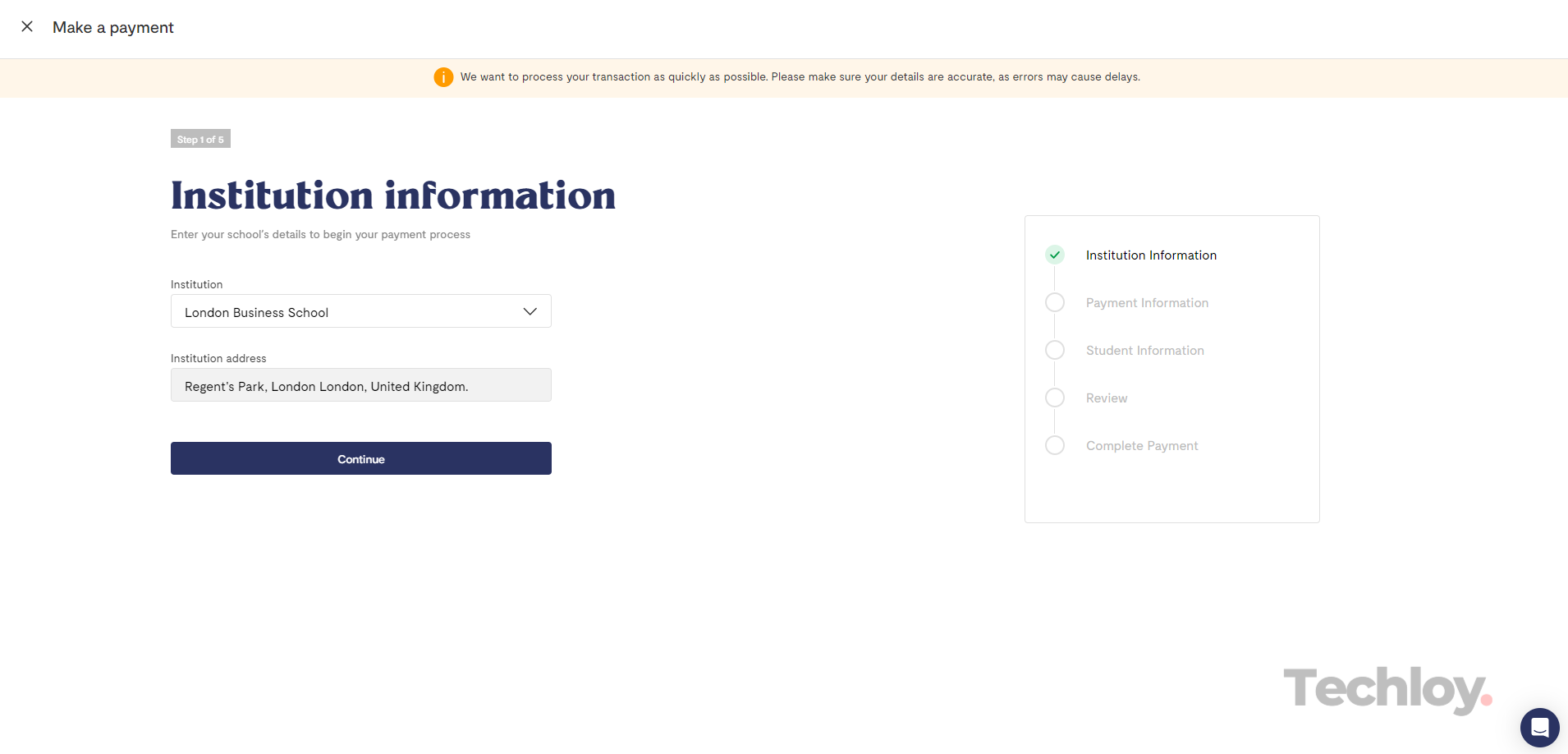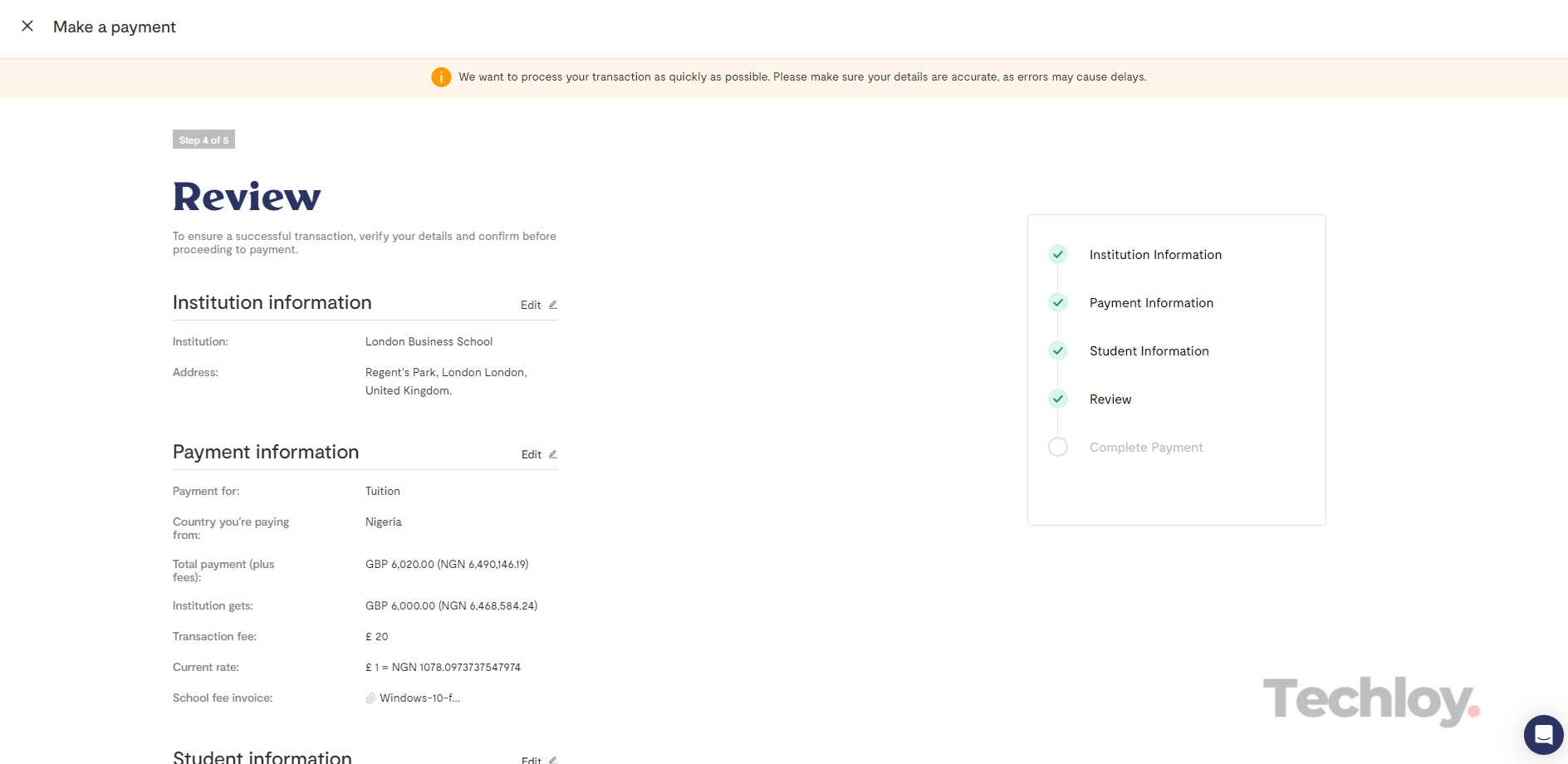 Review the institution information, payment information, and student information, and ensure that the information provided is correct. To make changes, click the "EDIT" button. Once you've confirmed that the information you provided is accurate to the best of your knowledge, click "Continue" to proceed with payment.