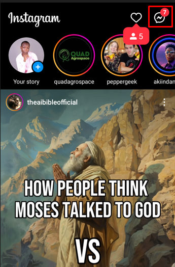 - Open your Instagram app and tap the message icon at the top right corner to access your DMs.