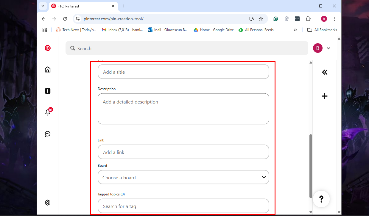 Step 3: After uploading your preferred media file, scroll down to add more information like a title, description, board, link, and tags